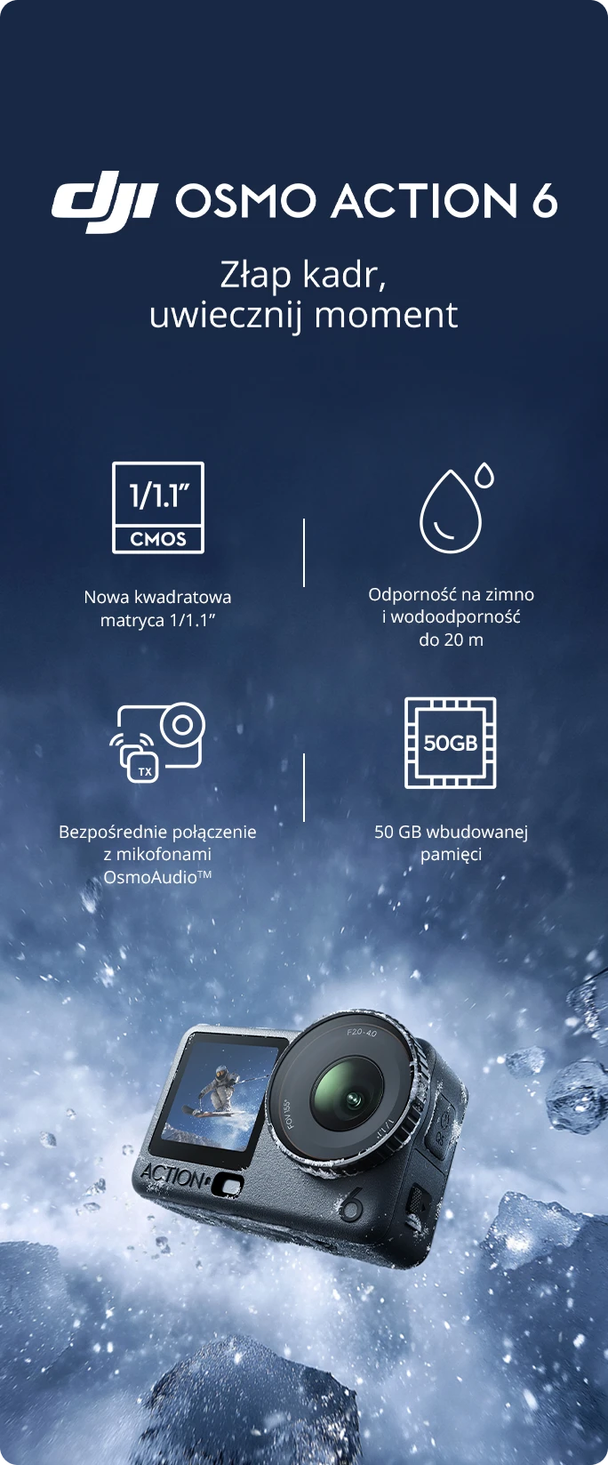 Kamery sportowe DJI Osmo Action 6 zostały stworzone z myślą o dynamicznym filmowaniu w niemal każdych warunkach – od ekstremalnych wypraw po codzienne aktywności. Łączą profesjonalną jakość obrazu i zmienną przysłonę z mobilnością i wytrzymałą konstrukcją, oferując pełną kontrolę nad kadrem, kolorem i ekspozycją. Wyróżnia je także odporność na mróz do -20°C, czas pracy do około 4 godzin i możliwość zanurzenia na głębokość do 20 m.