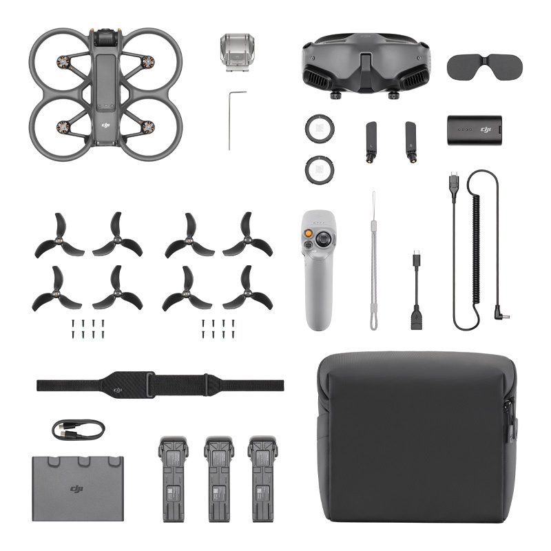 Zestaw DJI Avata 2 Pro-View Combo zawiera nie tylko drona, gogle i kontroler, ale też trzy inteligentne akumulatory, hub do ładowania oraz torbę na ramię. Jest to najbardziej kompleksowa konfiguracja, która pozwoli Ci porzucić obawy o czas lotu i sprawdzi się w większej liczbie scenariuszy.