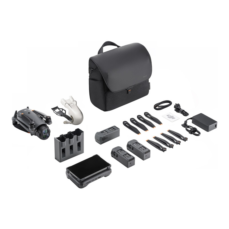 W skład zestawu Creator Combo wchodzi kilka akcesoriów, które rozszerzają możliwości drona i ułatwiają nagrywanie oszałamiających ujęć z powietrza. Nowy kontroler DJI RC Pro 2 wyróżnia się składaną konstrukcją, 7-calowym ekranem Mini-LED o wysokiej jasności i wbudowanym mikrofonem, dzięki czemu obsługa staje się znacznie wygodniejsza.11 Dostępny jest również zasilacz 240 W, który pozwala na jednoczesne ładowanie aparatury sterującej i akumulatora.11 Za jego pomocą możesz też ładować urządzenia mobilne przez port USB-C. Ponadto w opakowaniu znajdziesz torbę na ramię, która ułatwia transport sprzętu.